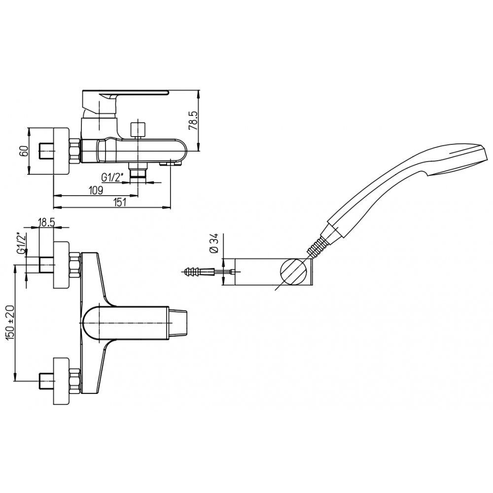 PAINI JOLLY MEZCLADOR MONOMANDO BAÑO-DUCHA MURAL CON EQUIPO DUCHA, SOPORTE FIJO