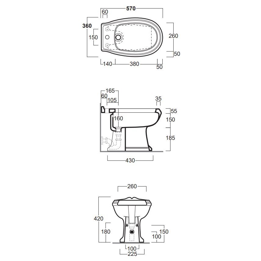 El set incluye: AR811 - inodoro tradicional de suelo con desagüe de pared Ficha técnica AR823 - bidé a ras de pared con un orificio con reborde (con el borde interno) Ficha técnica AR002 - asiento de inodoro de poliéster blanco con bisagras cromadas
