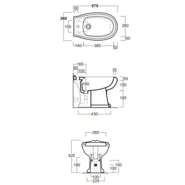 El set incluye: AR811 - inodoro tradicional de suelo con desagüe de pared Ficha técnica AR833 - bidé de un orificio sin reborde (sin borde interno) Ficha técnica AR002 - asiento de inodoro de poliéster blanco con bisagras cromadas