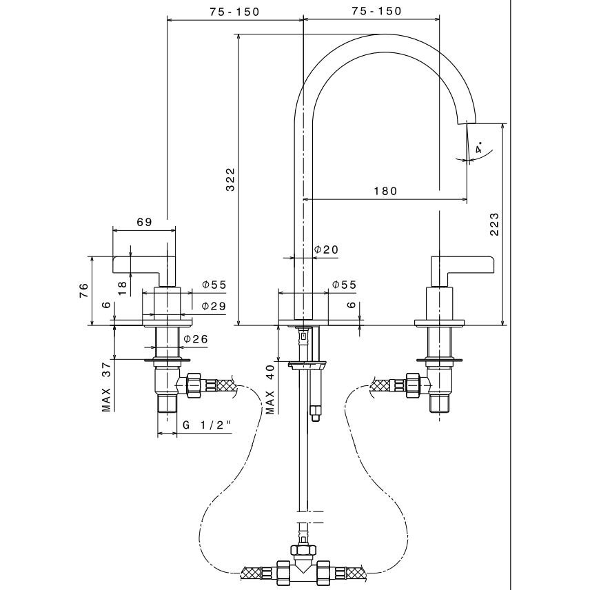 • QUADRO DESIGN VALVOLA01 MEZCLADOR DE LAVABO DE 3 AGUJEROS CON CAÑO GIRATORIO