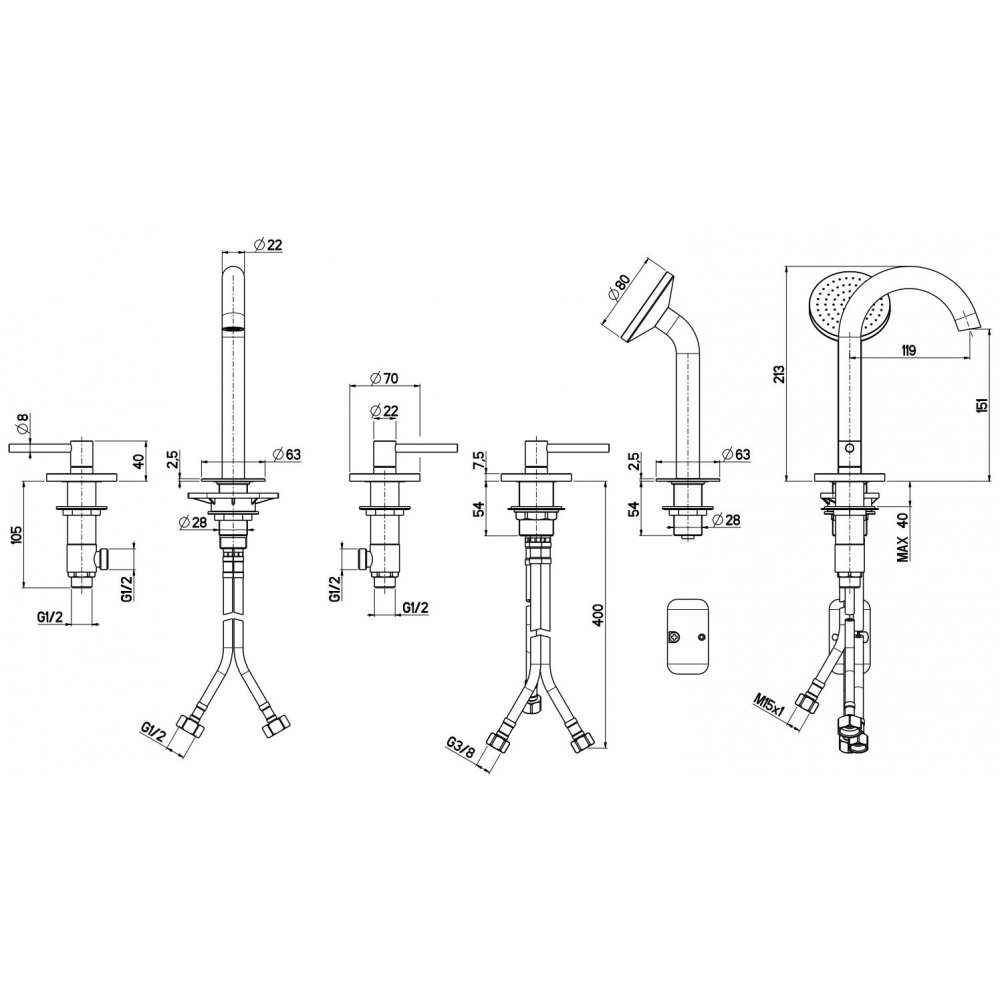 QUADRO DESIGN FFQT BATERÍA DE 3 AGUJEROS CON CAÑO Y MEZCLADOR