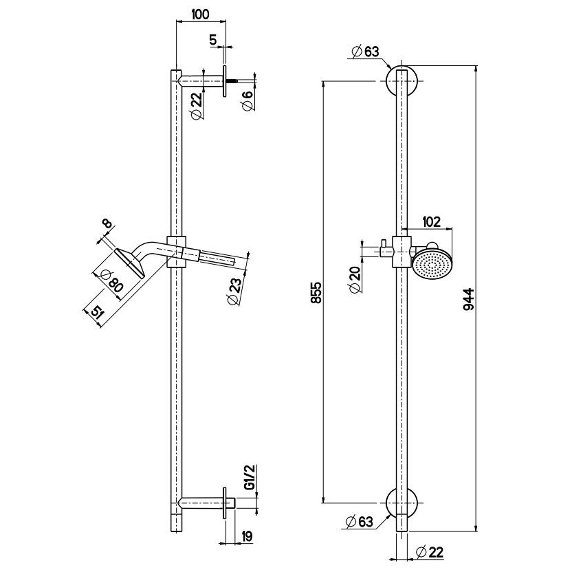 Barra corredera con salida de agua y ducha.