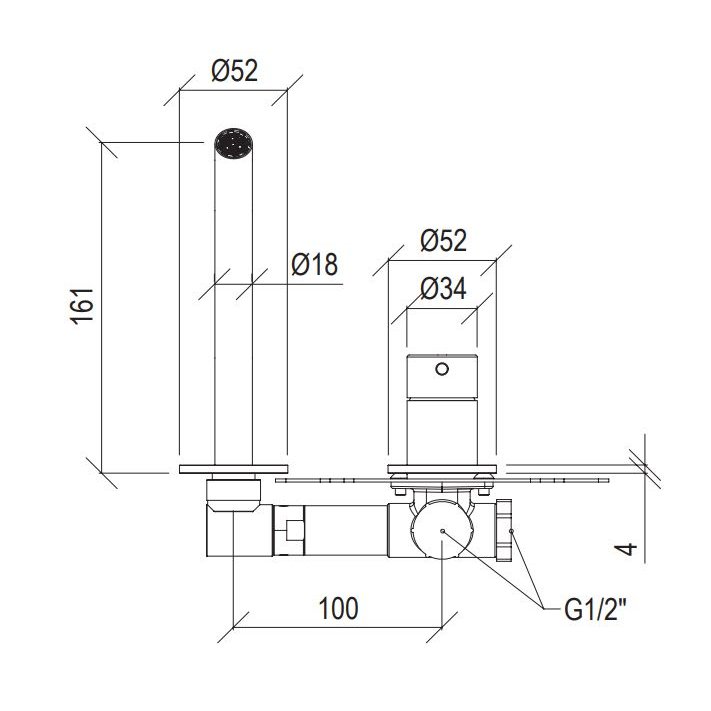 Mezclador oculto para lavabo, de 34 mm de diámetro, fabricado en acero inoxidable 316L, con caño de 16 cm de longitud, aireador anticalcáreo M16,5x1 y conexión G1/2".