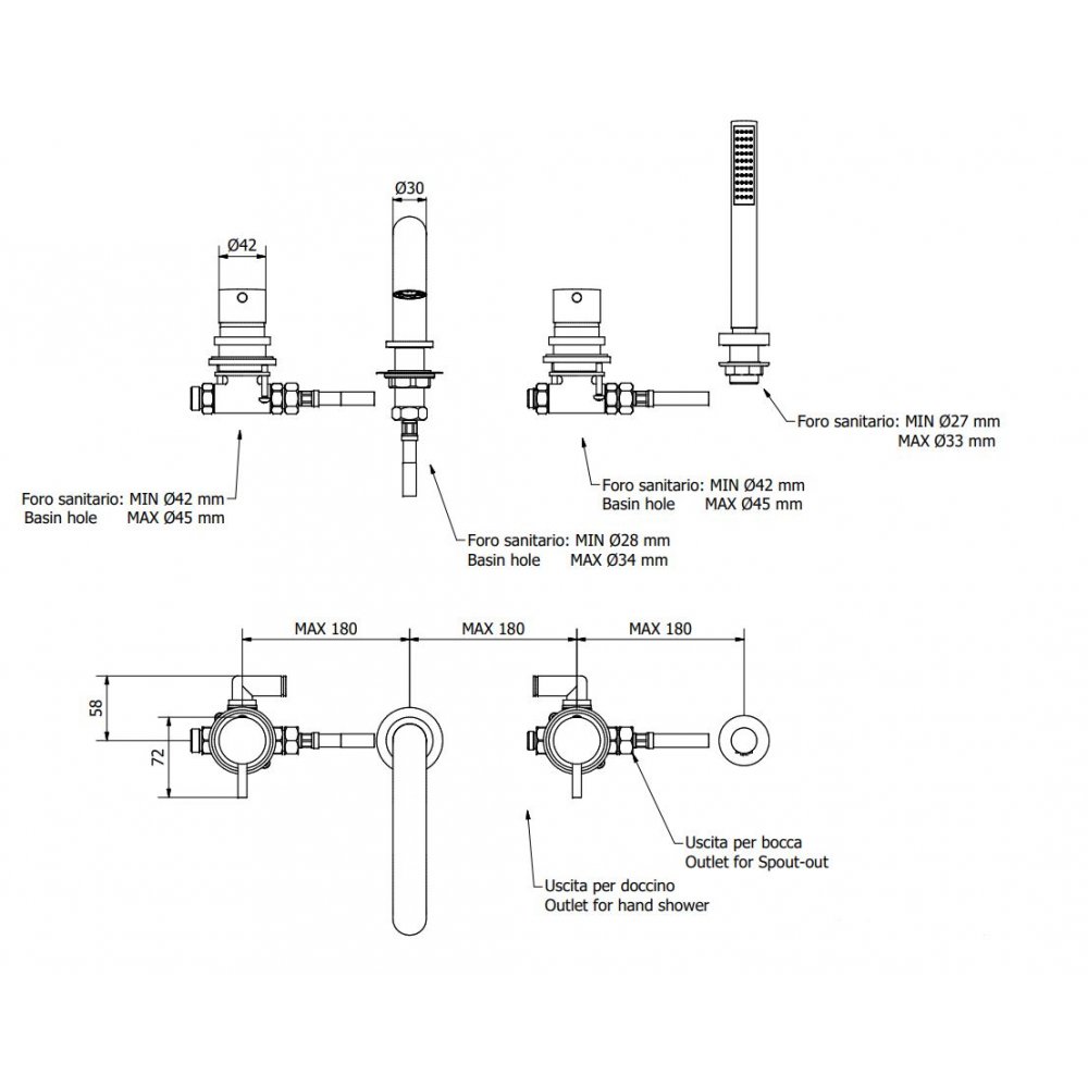 IB RUBINETTERIE MILANOTORINO MEZCLADOR BAÑERA 4 ORIFICIOS CON DESVIADOR CROMADO