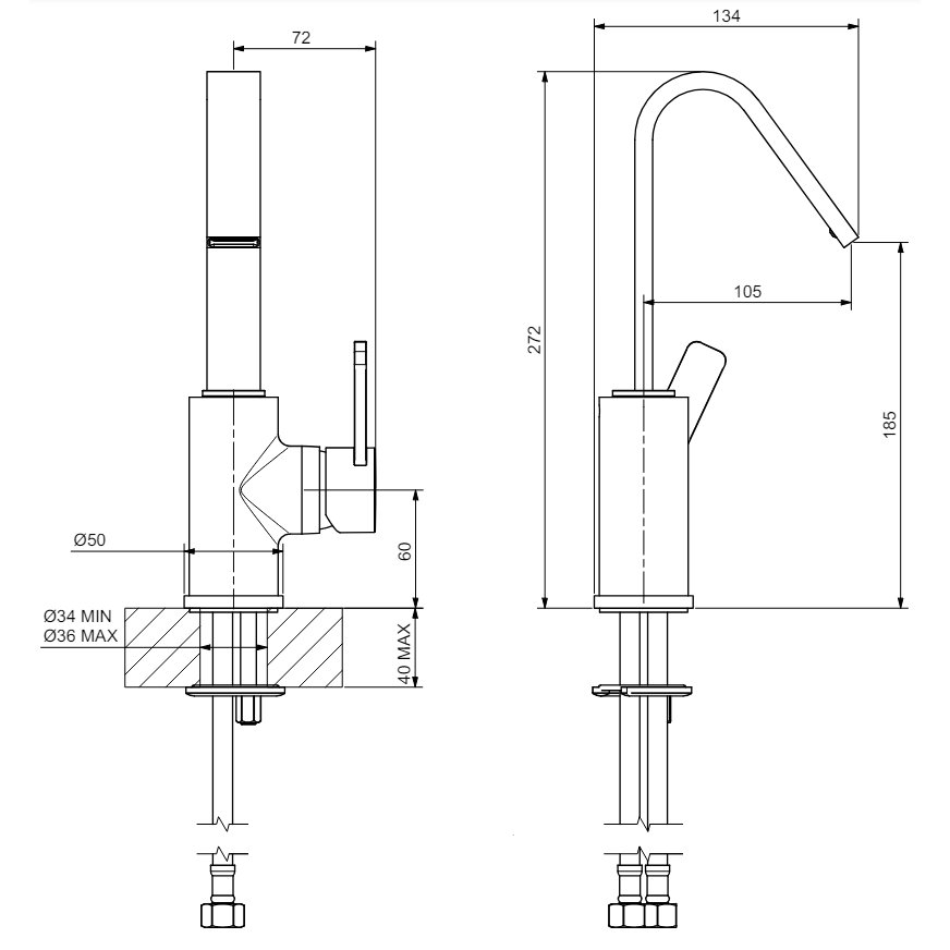 Mezclador monomando de lavabo sin desagüe con caño plano giratorio, con flexo de acero inoxidable y cartucho de 35 mm.