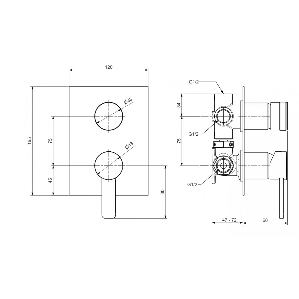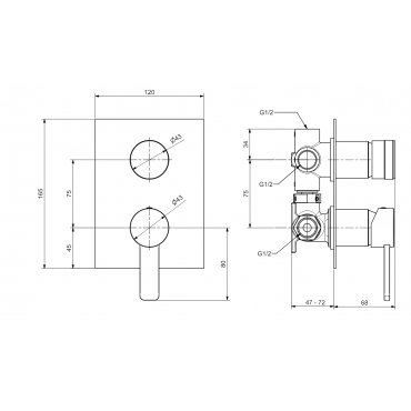 Monomando empotrado de 3 vías con desviador manual y cartucho de 35 mm.