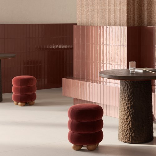 Un elemento característico de la colección es la estructura tridimensional Hashi, disponible en el formato 12,5 x 25 cm y en tres colores pastel vibrantes, que confiere a las paredes una materialidad única.