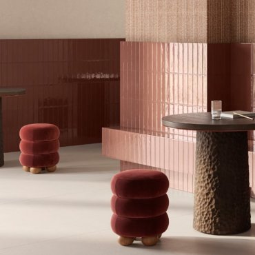 Esta colección se distingue por su superficie brillante y táctil, caracterizada por cinco piedras de 6 x 25 cm, un formato muy de moda.