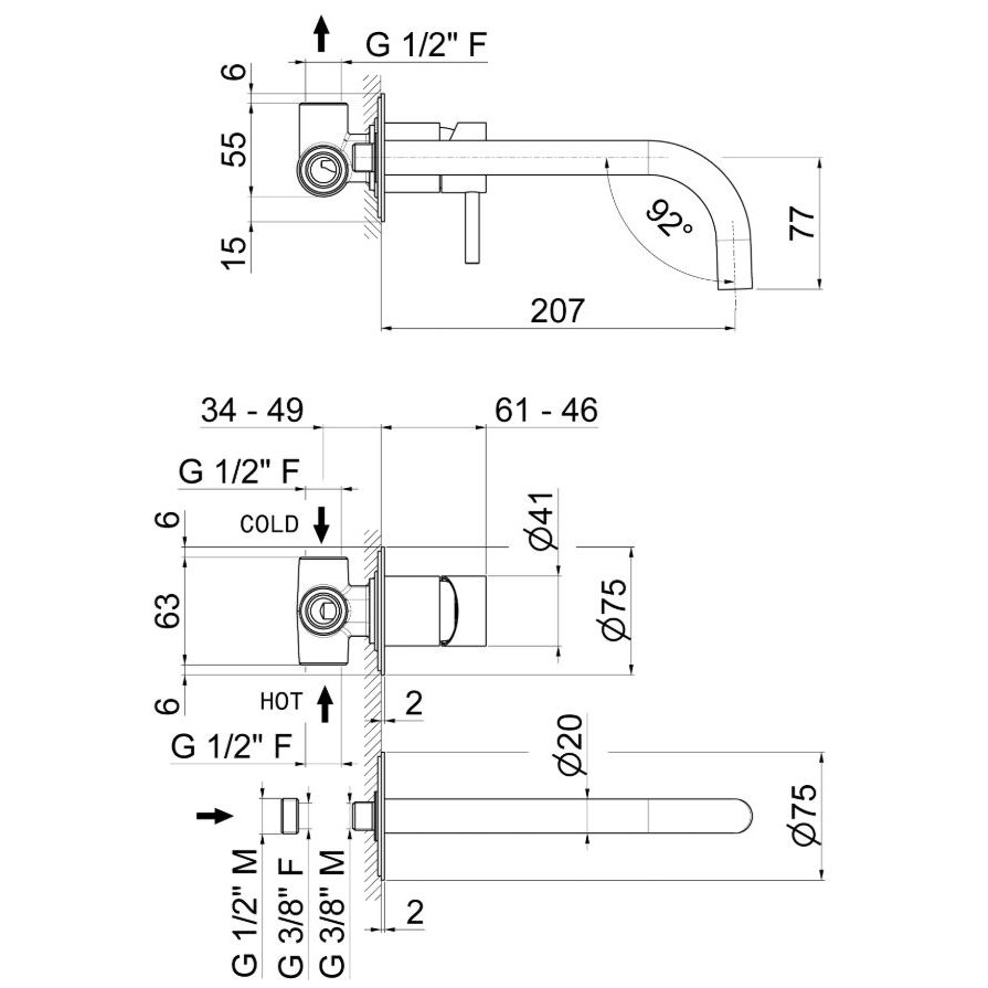 Grupo mezclador monomando mural para lavabo, completo con piezas ocultas, sin desagüe, con caño LL. 207 mm y sin grifería de conexión.
