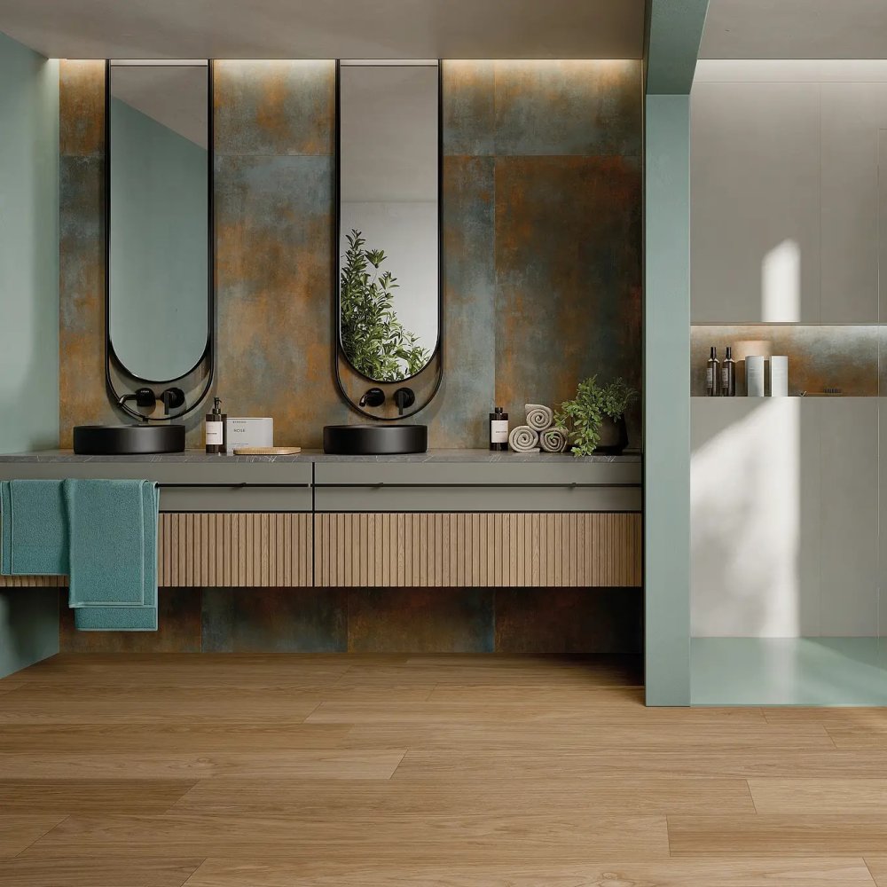 La serie de baldosas Aurea, de pasta blanca, de Ceramica Rondine se inspira en el ladrillo visto tradicional y lo reinterpreta con un toque moderno, creando superficies llenas de encanto y con un aire antiguo.