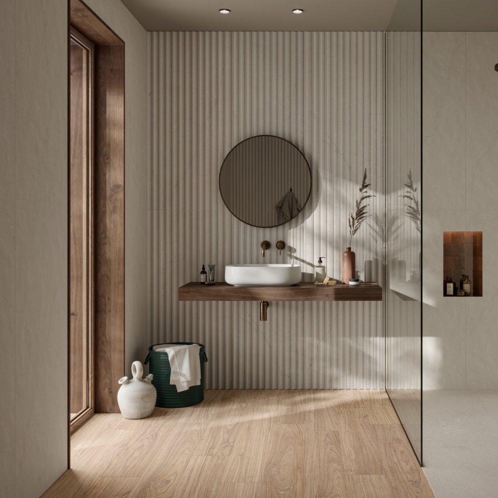 La colección de revestimientos Crea de Marazzi convierte la pared de simple fondo en protagonista absoluta del espacio. Marazzi reinventa el concepto de superficie arquitectónica con un formato modular de gran tamaño, 60 x 135 cm, pensado para crear paredes de gran impacto visual y continuidad en entornos residenciales y comerciales de prestigio. Crea no es solo un revestimiento, sino una auténtica herramienta de diseño que permite esculpir el espacio y ofrece una solución escenográfica, contemporánea e inequívocamente refinada.