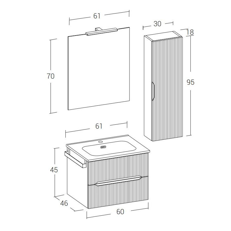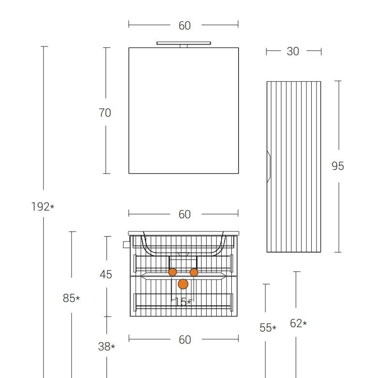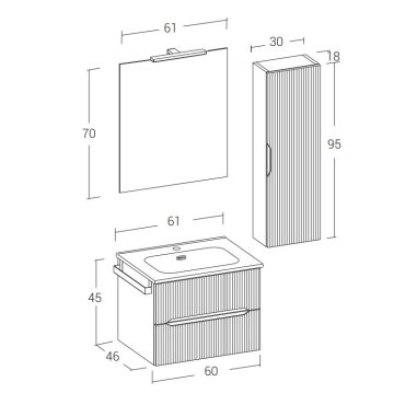 MUEBLE DE PARED 2 CAJONES DE 60CM CON LAVABO, ESPEJO Y ARMARIO COLGANTE - VE09