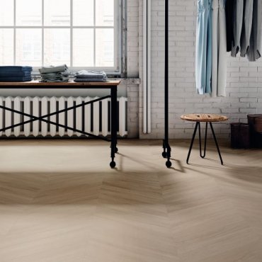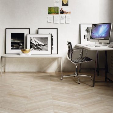 Disponible en solo dos tamaños, 15x90 y 11x54 con corte Chevron , es muy adecuado como revestimiento desuelos y paredes .