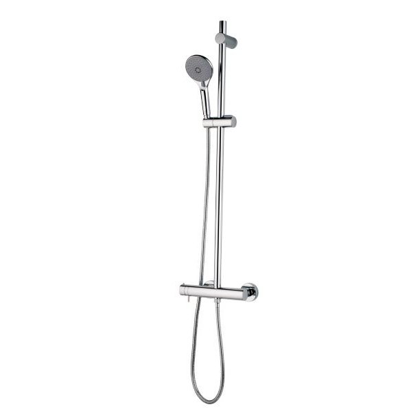 Asta murale cm 90 Ø 25 mm con miscelatore termostatico esterno e supporto a muro superiore regolabile in altezza, doccia e flessibile ottone DA o Cromolux 150 cm.