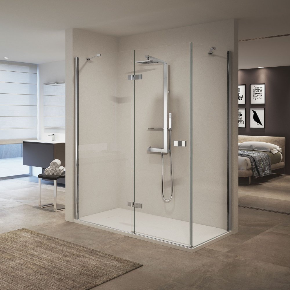 CABINE DE DOUCHE D'ANGLE, AVEC OUVERTURE 1 PORTE BATTANTE ET 1 FIXE EN LIGNE AVEC 1 PANNEAU LATÉRAL FIXE