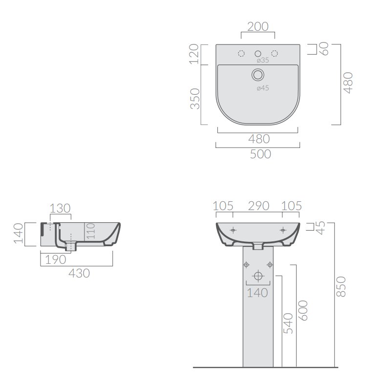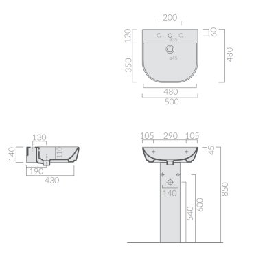 Lavabo monotrou cm 50 avec 3 trous. Suspendu ou pour colonne. Fixation incluse.