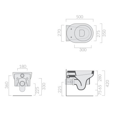 WC suspendu 50x36 cm. Couverture thermodurcissable enveloppante, charnière avec dispositif de chute lente.