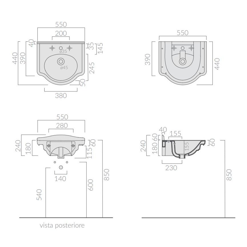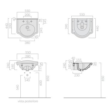 Lavabo cm 55. Installation suspendue, sur colonne ou sur meuble. Fixation incluse.