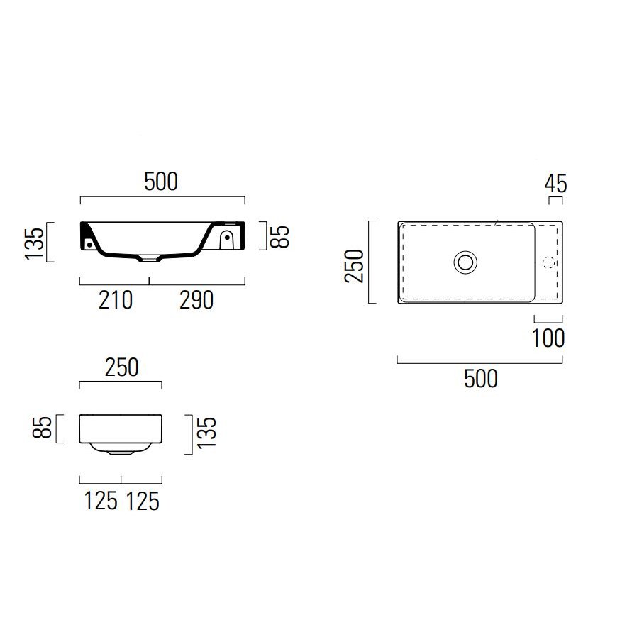 Lavabo rectangulaire sans trou de trop-plein de dimensions 50x25cm, prédisposé pour un plan de robinetterie monotrou à droite ou à gauche.