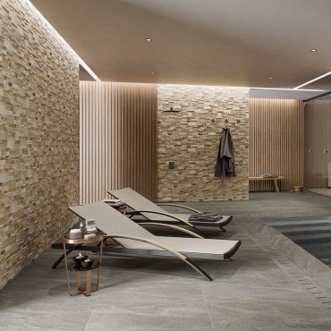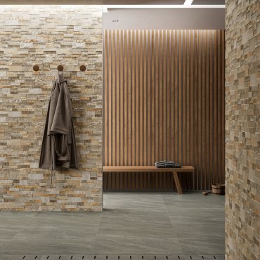 Gli effetti pietra e legno dei moduli riflettono un’atmosfera naturale e per questo sono particolarmente adatti ad ambienti dedicati al benessere grazie anche al fatto che le superfici NovaBell sono immuni all’acqua e di conseguenza adatte ad ambienti umidi.