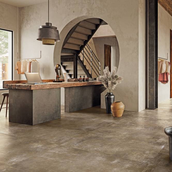 Plant di Refin si identifica come un gres porcellanato dall’effetto cemento, dal gusto moderno e minimale. 6 nuance dalla palette beige-marrone con un grado di stonalizzazione V4.