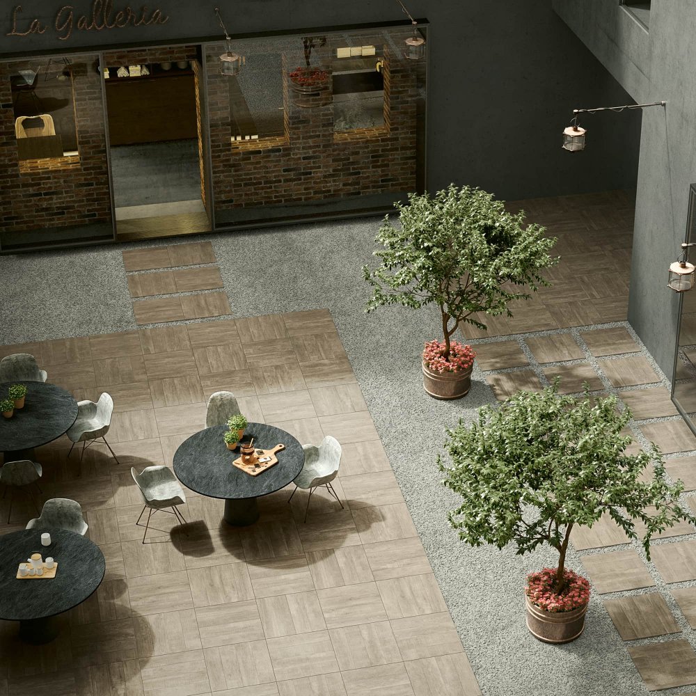 Le tre nuance sobrie e monocolore Tortora, Light Grey e Grey, con finitura antiscivolo, sono perfette per qualsiasi tipo di design e soluzione.
