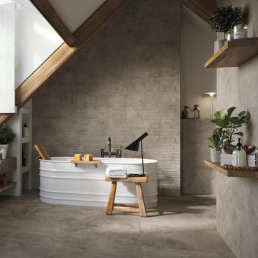 La collezione permette anche di creare un rivestimento che rievoca una pietra consumata dal tempo, dalle tonalità morbide e sfumate. Aix prende ispirazione da antiche pietre calcaree utilizzate come matrice e recuperate una ad una in lastre di varia pezzatura.