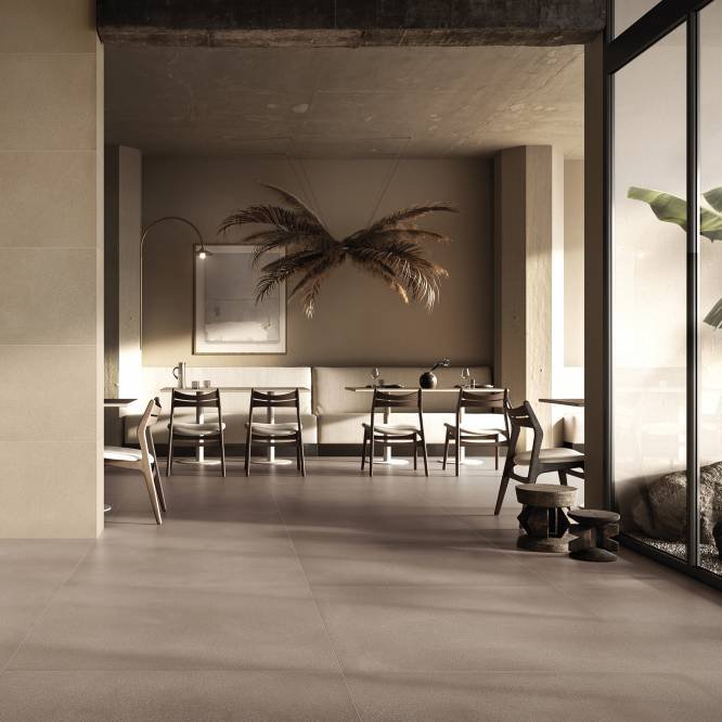 Dolci e soffici riflessi di luce carezzano le superfici effetto cemento, creando armonia e disegnando un'atmosfera eterea che pervade gli spazi, catturando l'essenza della semplicità di un gres porcellanato unico nel suo genere.