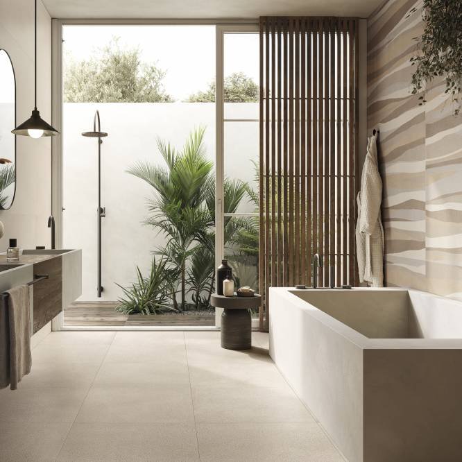 La meraviglia di un mondo remoto si insinua nella quotidianità degli interni della collezione Namib di Ceramiche Refin, portando con sé un senso di vastità e purezza.