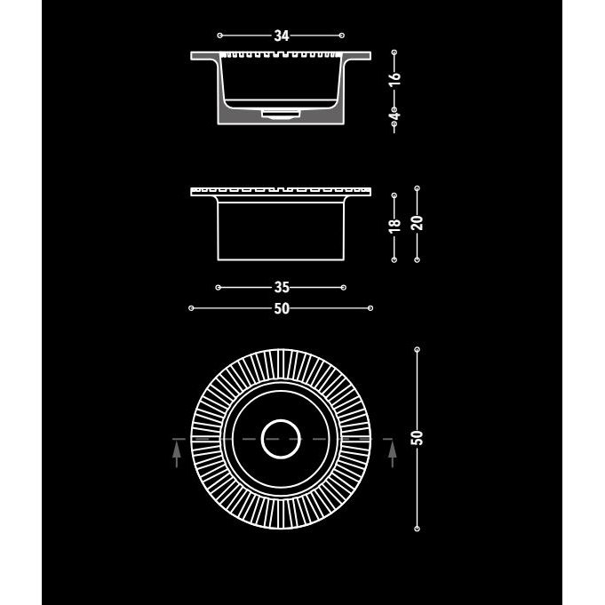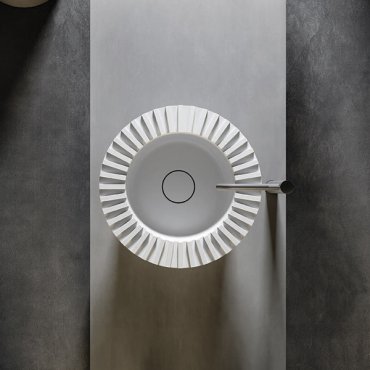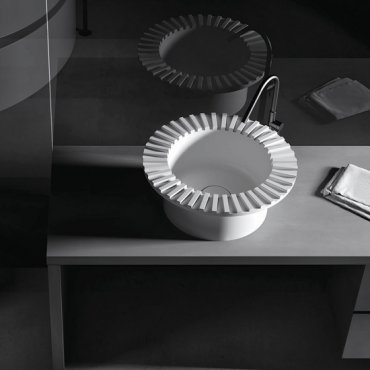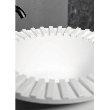 Il lavabo da appoggio Elios si distingue per il suo corpo cilindrico capiente, sormontato da un anello perimetrale che presenta una raggiera scanalata lungo la superficie, progettata per facilitare il deflusso dell'acqua nel bacino.