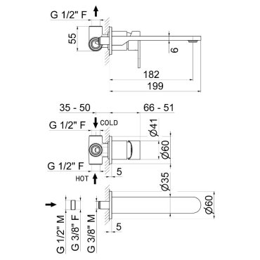 Gruppo miscelatore monocomando a parete per lavabo completo di parti incasso, senza scarico, con bocca LL. 200 mm e senza raccorderia di collegamento.