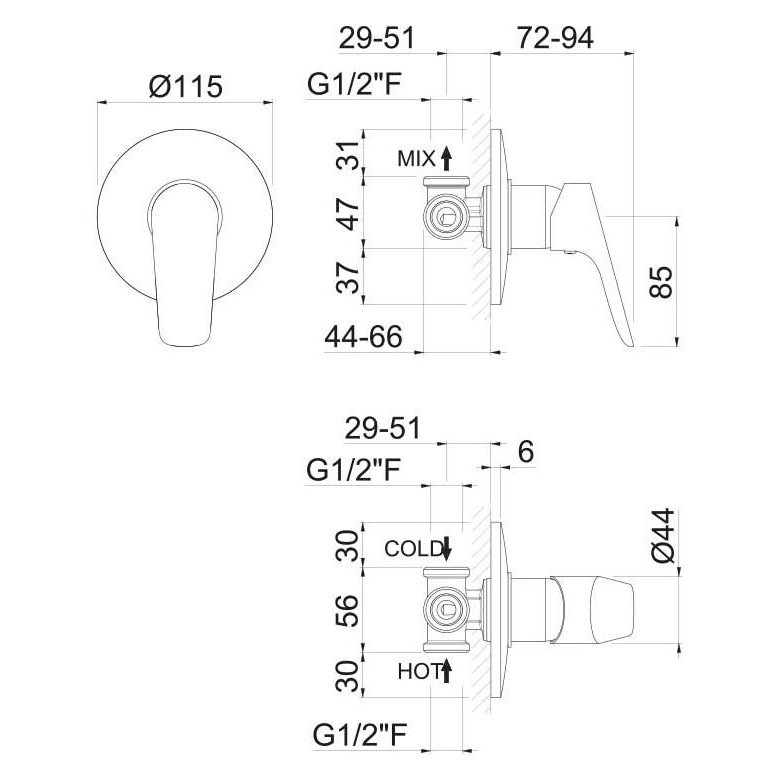 Miscelatore monocomando doccia da incasso, completo di corpo incasso.