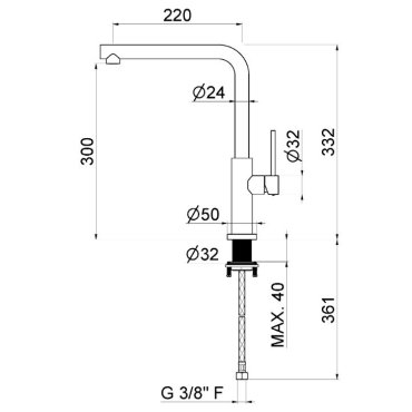 Miscelatore monocomando per lavello con canna “L” girevole. Flessibili di alimentazione F 3/8”.