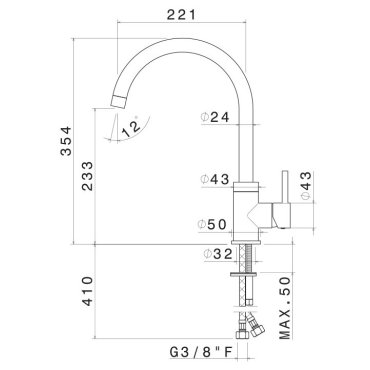 Miscelatore monocomando per lavello con canna tonda girevole. Flessibili di alimentazione F3/8”.