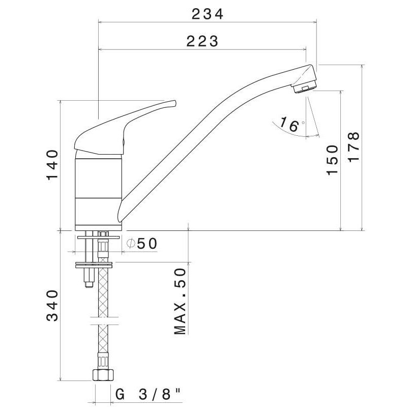 Miscelatore monocomando per lavello con canna girevole. Flessibili di alimentazione F3/8”.