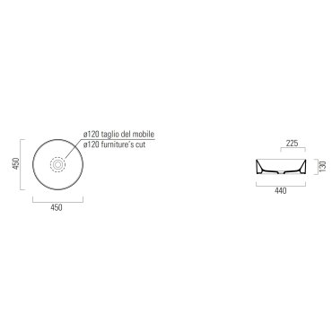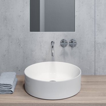 Lavabo rotondo da appoggio con diametro di 45 cm senza foro troppopieno.