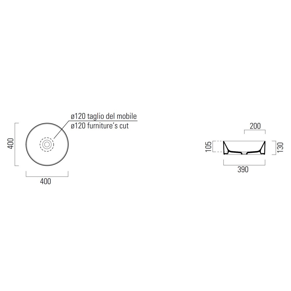 Lavabo rotondo da appoggio con diametro di 40 cm senza foro troppopieno.