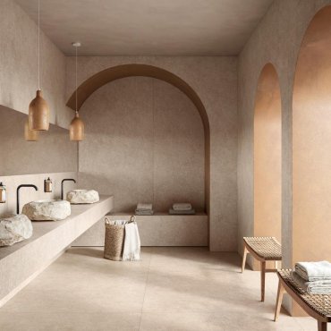 Caratterizzata da un'estetica "rustic-chic", questa serie in gres porcellanato reinterpreta la pietra naturale con sensibilità moderna.